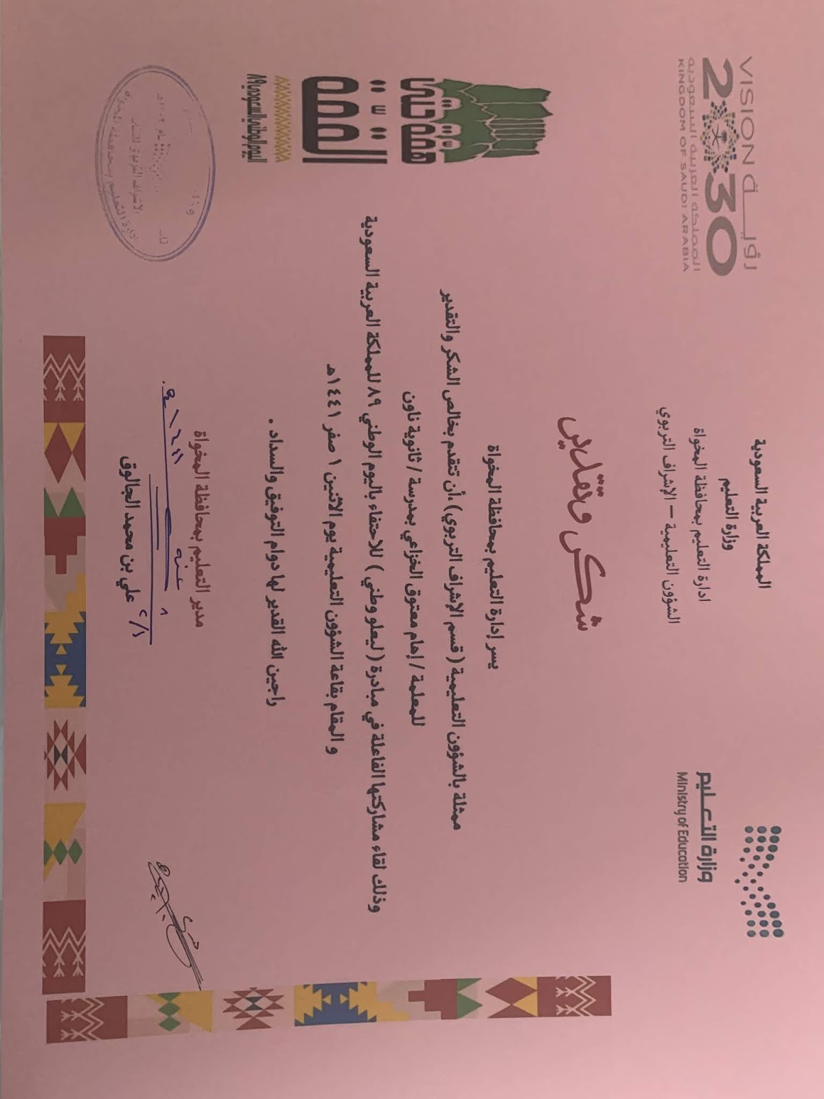 شهادة شكر للطالبه على عدم الغياب